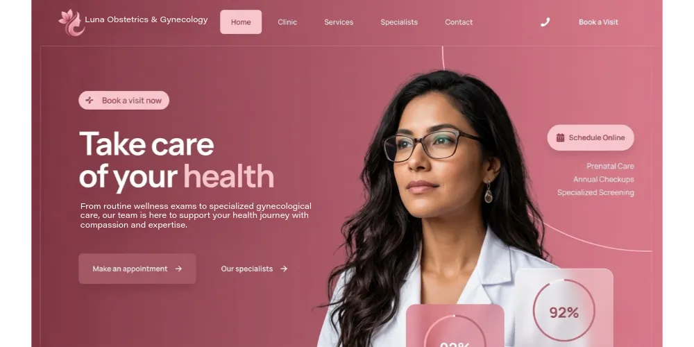 Dynamic Data Integration: Modern glassmorphism UI elements highlight patient success metrics and key services like prenatal care and screenings.