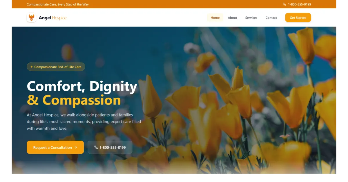 Clear Hierarchy: Bold typography prioritizes the core mission—Comfort, Dignity & Compassion.